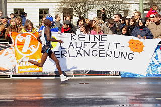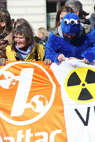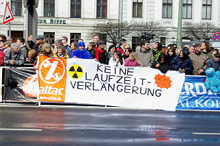 | Berlin, 28.3.2010 - attac-Blitzaktion gegen die Laufzeitverlängerung für die Vattenvall-Atomkraftwerke Krümmel und Brunsbüttel (Fotos: Hartmut Ihlefeldt) |
