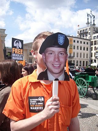 | Berlin, 28.5.2011 - Protest gegen die Inhaftierung von Bradley Manning, der ein entlarvendes Irak-Kriegs-Video an Wikileaks gegeben haben soll (Fotos in geringer Auflösung) |