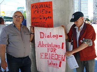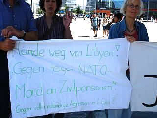 | Berlin, 4.6.2011 (1) - "Hände weg von Libyen" - Protest gegen den völkerrechtswidrigen Krieg der NATO–Staaten gegen Libyen - alle 14 Tage an der Weltzeituhr (Fotos in geringer Auflösung) |