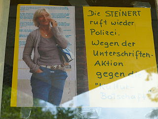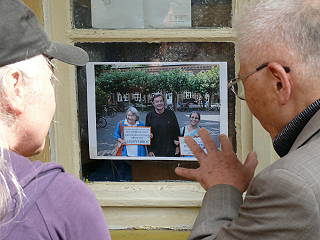 ![]() 7 Ausstellung in den Fenstern des Pförtnerhäuschens - die Vorstandssprecherin Steinert ruft die Polizei, um das gegen Walter Herrmann ausgesprochene Hausverbot durchsetzen zu lassen |