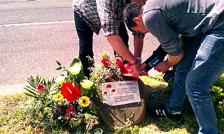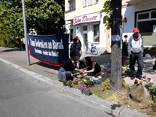 14 Aus dem Aufruf zum Gedenken: "Einen Monat nach dem 4. Todestag Burak Bektas treffen wir uns wieder an der Todesstelle. Nachdem die dortige Gedenktafel mutwillig beschädigt wurde, werden wir sie durch eine neue ersetzen. Außerdem wollen wir die Stelle schön machen, bringt dafür gerne Blumen und andere Dinge mit! Das Gedenken an Burak Bektas muss seinen Platz haben. Dies fordern wir auch mit unserer neuen Kampagne für einen 'lebendigen Gedenkort'. Wir wollen gemeinsam mit den Angehörigen und Freund*innen von Burak einen sichtbaren und lebendigen Gedenkort schaffen, um die Erinnerung an Burak wachzuhalten. Für ein sichtbares und lebendiges Gedenken!" (Siehe auch: gedenkort-fuer-burak.org) | |